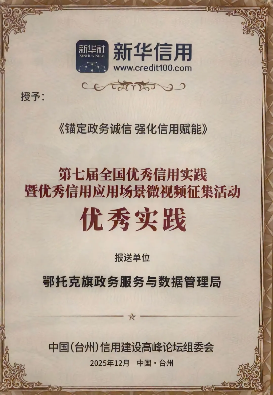 12月13日,第七届中国城市信用建设高峰论坛在浙江台州举行。鄂托克旗政数局报送的“锚定政务诚信 强化信用赋能”案例凭借扎实成效与创新特色,在众多案例中脱颖而出,获评“全国信用应用场景优秀实践案例”。详情>>>
