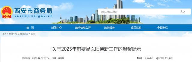 12月12日,西安市商务局官网发布了关于2025年消费品以旧换新工作的温馨提示,旨在有序推进2025年消费品以旧换新补贴资金的清算工作,保障补贴资金能够及时、准确地拨付到位。(信息来源:西安市商务局)