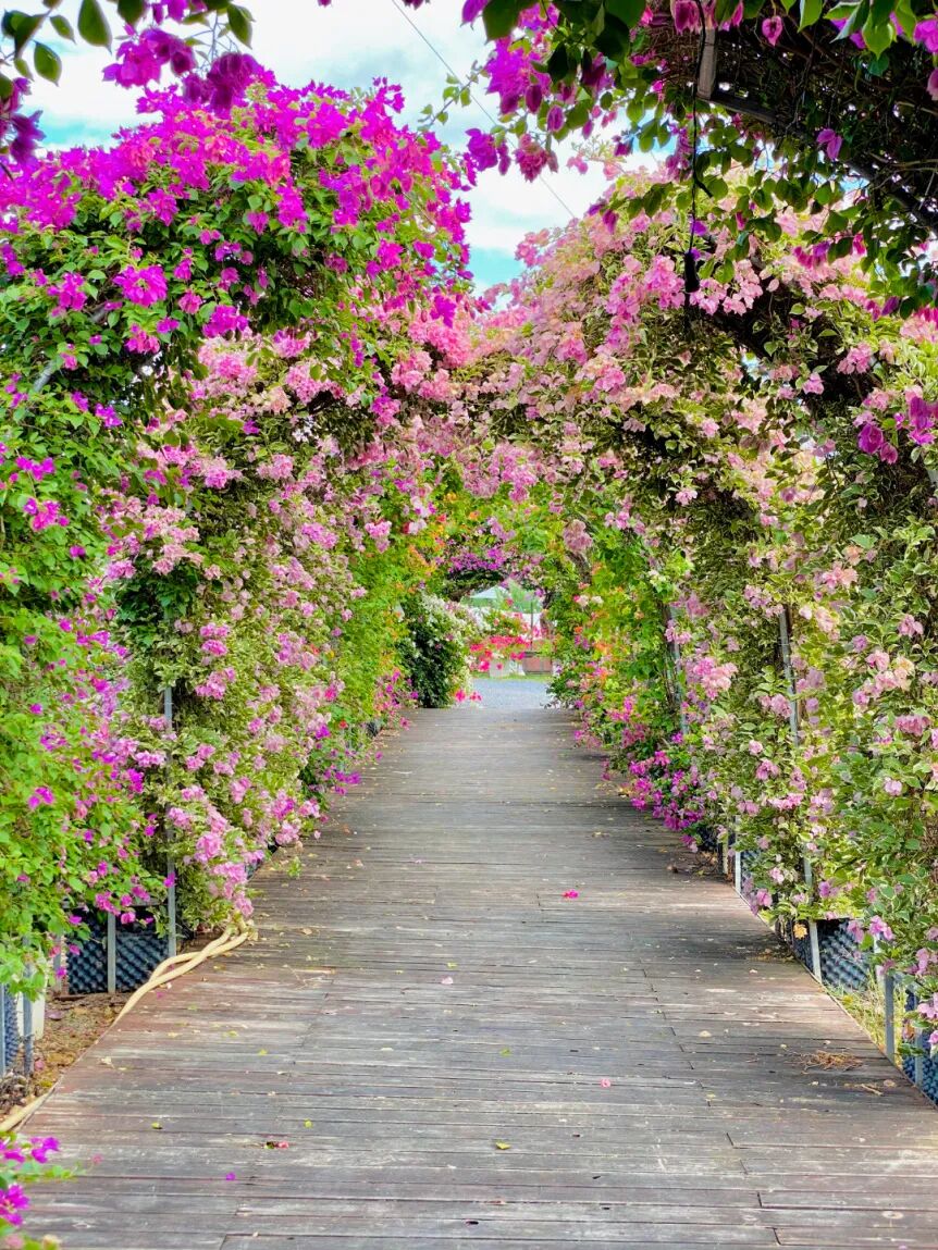 化身“画中人”:漫步在蜿蜒的花径上,每一步都似踏在浪漫的旋律里。经典的鲜花拱门,还有那面超适合拍照的三角梅花墙,都是为你准备的绝佳背景。不用特意找角度,随手一拍,你就是花海中最亮眼的主角。