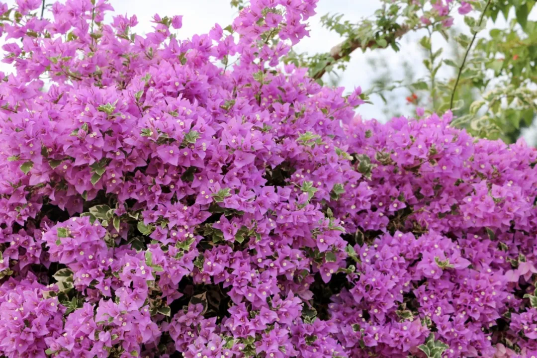 红色、粉色、紫色、白色的三角梅,从棚架上倾泻而下,宛如秋日里被定格的绚烂瀑布。这里并非普通花园,而是三角梅精心编织的一场浪漫梦境。