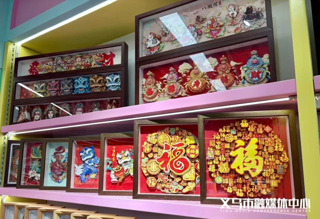 商铺内,财神相框画、Q版八骏图相框画整齐陈列,“柿柿如意”扭扭棒盆栽、招财冰箱贴摆件也格外亮眼。纸想造物专注潮玩文创,致力于将传统文化与创意设计结合,打造国风好物。今年楼靖睿把三成新年产品设计成Q版形象,让传统文化更具新意与年轻活力。