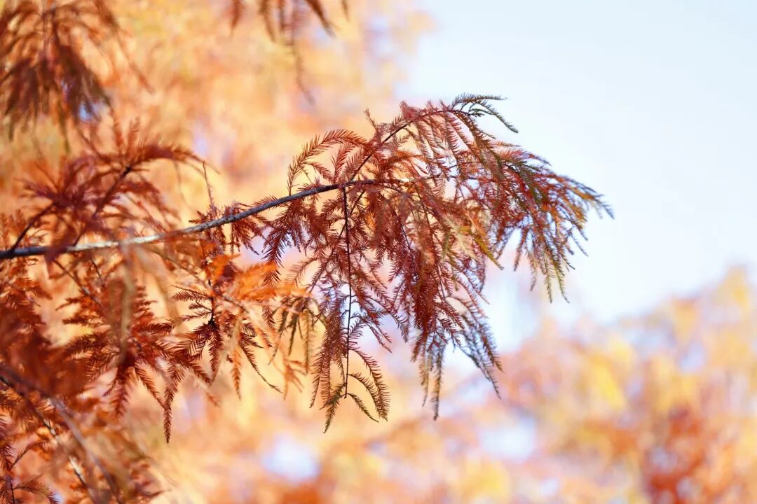 树林的影子倒映在水中,更添几分诗意。忽然,几片红杉细叶从枝头飘落,在光影交织的空气中悠悠旋转而下……