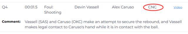 第二次争议出现在比赛结束前1.5秒,卡鲁索触球后第一时间出手未能命中,随后摔出底线。他认为防守自己的瓦塞尔存在犯规动作,但裁判报告显示,当时瓦塞尔与卡鲁索正在拼抢篮板,瓦塞尔在卡鲁索手部触球的瞬间与其手部发生的接触属于合理身体对抗,不构成犯规。