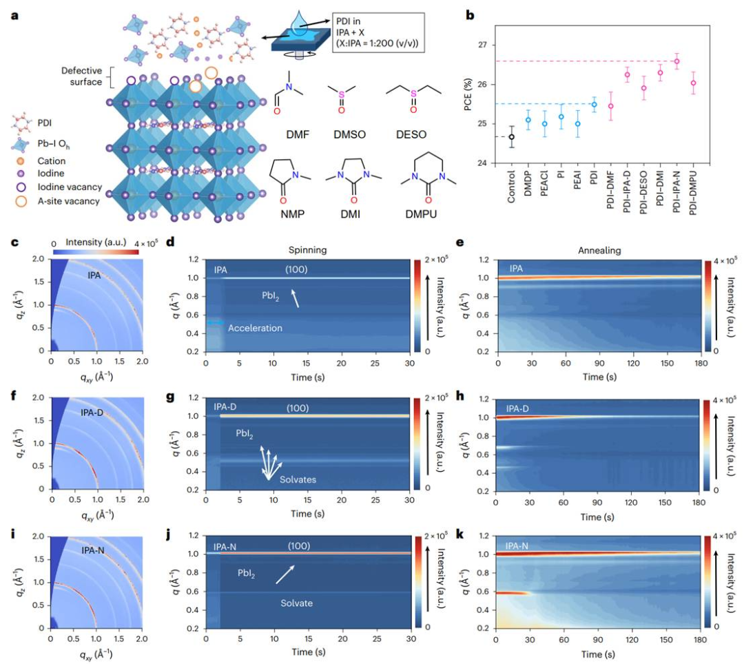 1.二碘哌嗪在弱极性异丙醇(偶极矩1.66 D)中溶解度低,限制了钝化效果。本研究在二碘哌嗪-异丙醇溶液中引入微量极性非质子溶剂(体积比1:200),旨在溶解钙钛矿薄膜超薄表层实现表面相变。尝试典型母溶剂N,N-二甲基甲酰胺(DMF)时,含DMF的溶液对器件平均效率提升有限,可能因钙钛矿表面形成δ相;而添加异丙醇-二甲亚砜、异丙醇-NMP等体系时效率显著提升,其中异丙醇-NMP组合平均效率超26.5%。