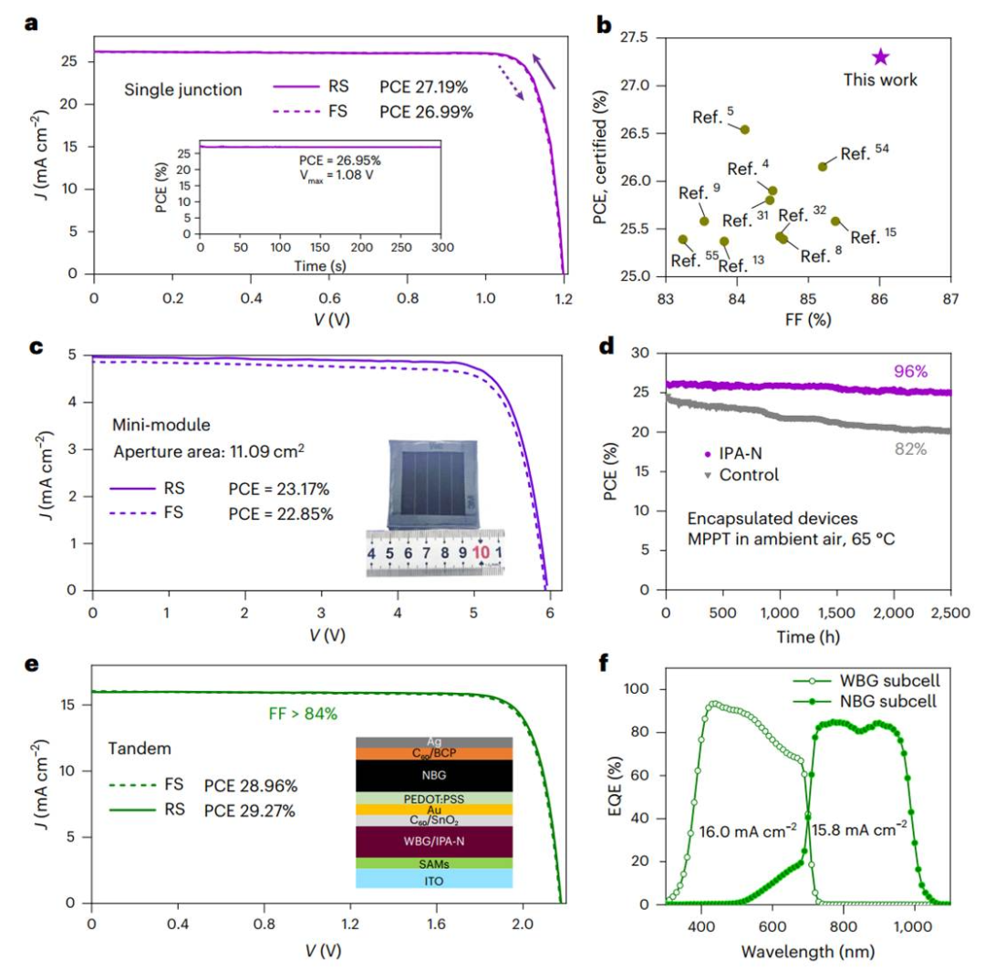 为验证异丙醇-NMP策略的普适性,本研究制备了不同带隙的宽带隙钙钛矿电池,FA₀.₈Cs₀.₂Pb(I₀.₈Br₀.₂)₃(带隙1.68 eV)和FA₀.₈Cs₀.₂Pb(I₀.₆Br₀.₄)₃(带隙1.77 eV)器件效率分别达22.92%和21.15%,在锡-铅混合钙钛矿体系中也有积极作用。采用该策略的1.77 eV宽带隙钙钛矿制备全钙钛矿叠层电池,冠军器件效率29.27%,经中科院上海微系统所认证达29.08%,为全钙钛矿叠层电池认证效率最高纪录之一。本研究证实该策略适用于单结倒置器件、迷你组件及全钙钛矿叠层电池等多种架构。