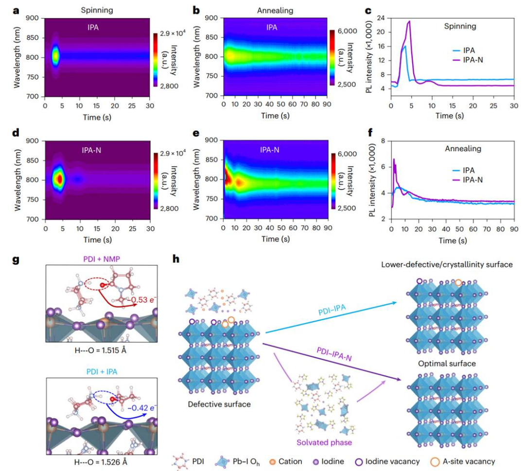 1.原位光致发光监测显示,异丙醇-NMP体系处理的钙钛矿薄膜在旋涂时PL强度达到峰值的时间延迟且强度更高,表明存在特殊钝化路径。核磁共振分析揭示二碘哌嗪与甲脒阳离子的强相互作用是表面钝化的关键,可阻止A位阳离子去质子化,抑制甲脒空位形成。