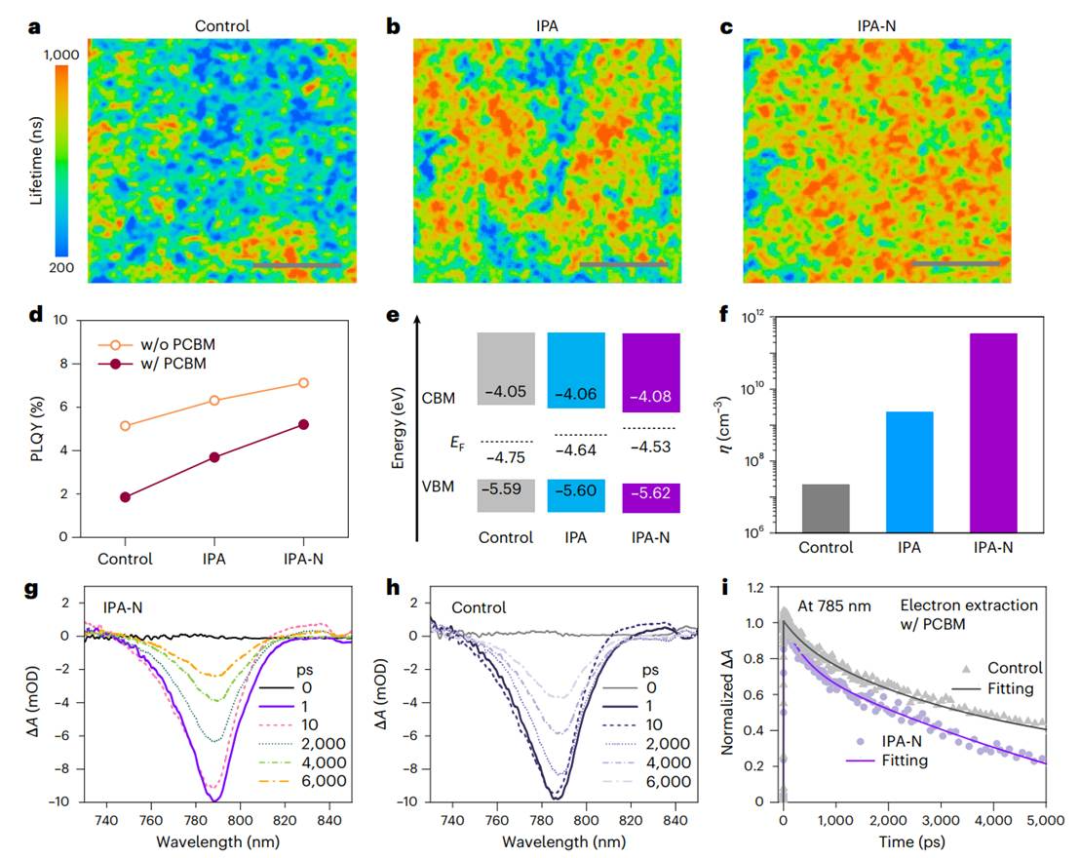 2.紫外光电子能谱测试表明,异丙醇-NMP处理后费米能级向钙钛矿表面导带底移动,利于电子提取;钙钛矿表面附近导带电子密度升至3.4×10¹¹cm⁻³,归因于增强的n型掺杂效应。飞秒瞬态吸收光谱显示,该体系处理能实现更早的电子提取,促进界面电荷提取过程。