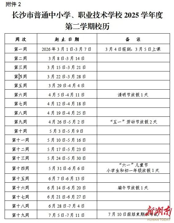 长沙:2026年2月1日开始放寒假,3月3日结束,3月5日正式上课。其中,2025年9月1日至2026年1月31日为第一学期,共22周;2026年3月5日至7月11日为第二学期,共19周,暑假从7月12日开始至8月29日结束。