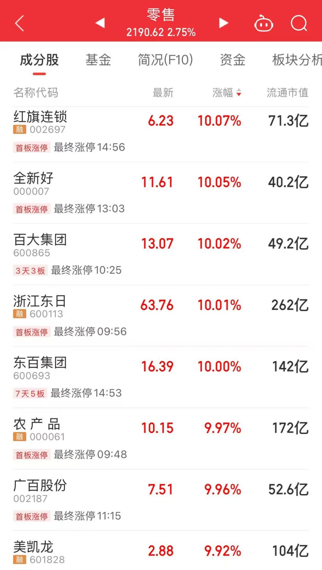 12月15日,这两大板块延续上涨趋势。零售板块中,红旗连锁、全新好、百大集团等个股成功涨停,其中百大集团实现3连板;商业航天板块内,航天电子、航天机电、航天信息等热门个股掀起涨停潮,超捷股份、西部材料、上海瀚讯、斯瑞新材等多只个股盘中股价创下历史新高。