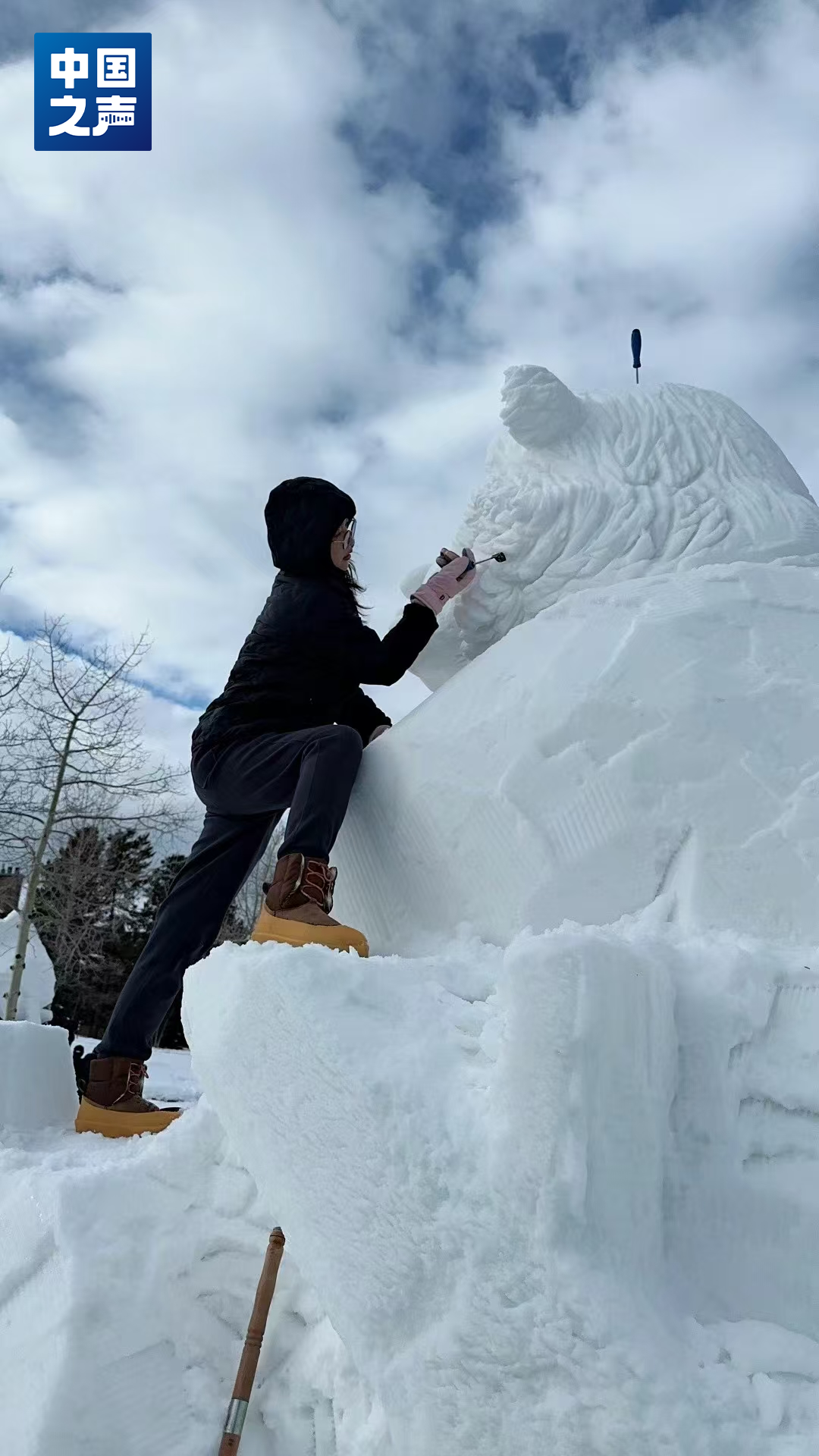 雪雕课必须在室外进行。雪花簌簌飘落,王海峰没戴帽子,跪在雪坯上,手持雪铲雕琢一匹马。每一铲都沉稳有力,马的眼、鼻、嘴逐渐显现,鬃毛也愈发清晰。学生的赞叹与铲车轰鸣交织,她却神情专注,完全沉浸在创作世界里。