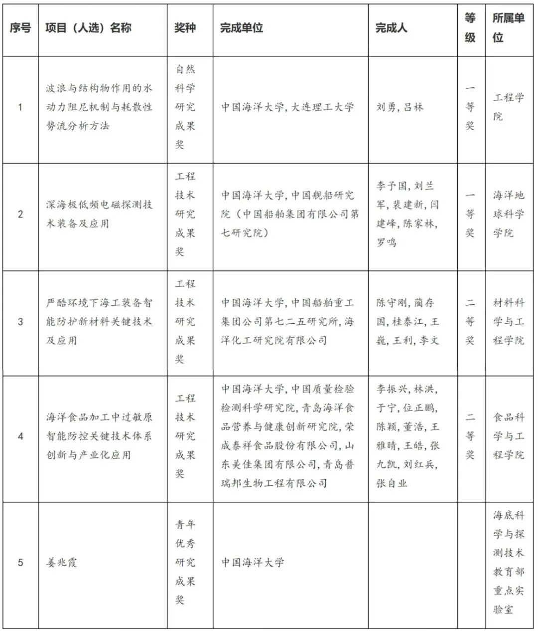 具体获奖情况如下:工程学院刘勇教授主持的“波浪与结构物作用的水动力阻尼机制与耗散性势流分析方法”项目,摘得自然科学研究成果奖一等奖;海洋地球科学学院李予国教授牵头的“深海极低频电磁探测技术装备及应用”,荣获工程技术研究成果奖一等奖。材料科学与工程学院陈守刚教授的“严酷环境下海工装备智能防护新材料关键技术及应用”、食品科学与工程学院李振兴教授的“海洋食品加工中过敏原智能防控关键技术体系创新与产业化应用”,均获得工程技术研究成果奖二等奖。此外,海底科学与探测技术教育部重点实验室的姜兆霞教授,成功斩获青年优秀研究成果奖,成为该校第二位获此荣誉的青年教师。