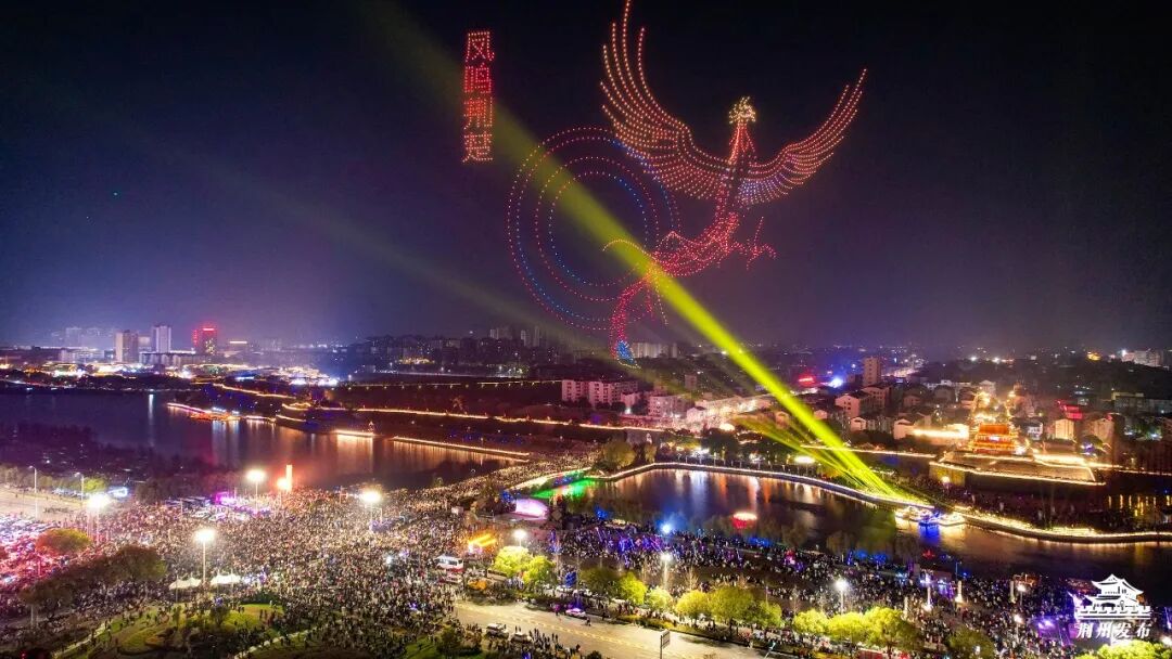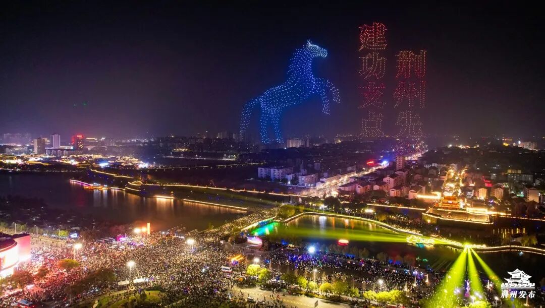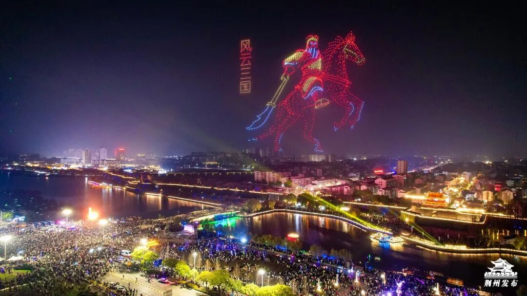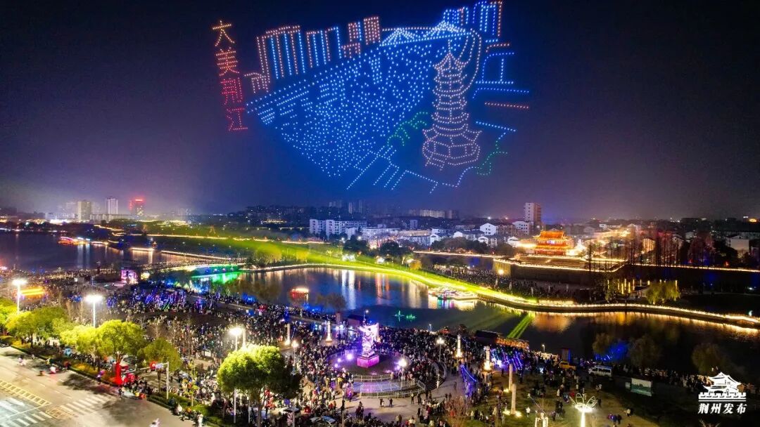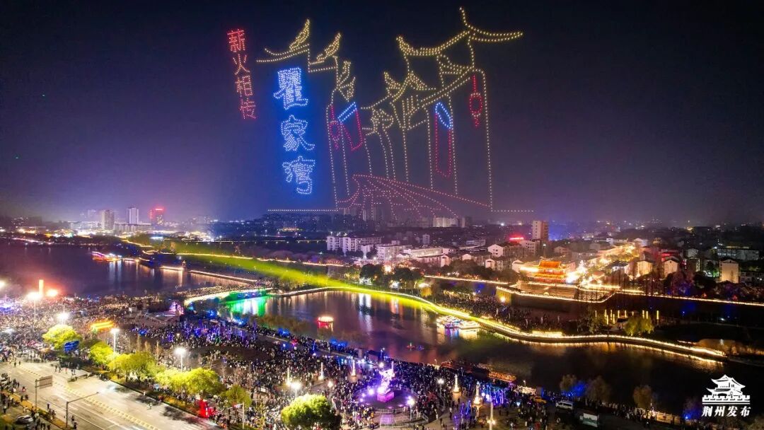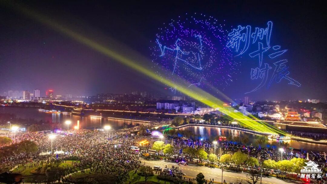 紧接着,2026架无人机在东门上空腾空而起,以夜幕为画卷,依次变幻出“凤鸣荆楚”“风云三国”、瞿家湾红色景区、大美荆江、美食街牌、宾阳楼城楼等绚丽图案,光影交织间与全城共贺元旦。