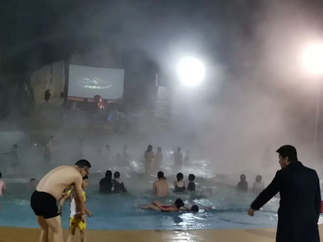 傍晚时分,水立方区域举办了迎新主题影片放映活动,游客们在温泉区附近观看电影,“泡温泉+看电影”的组合让大家感受到了独特的休闲体验。