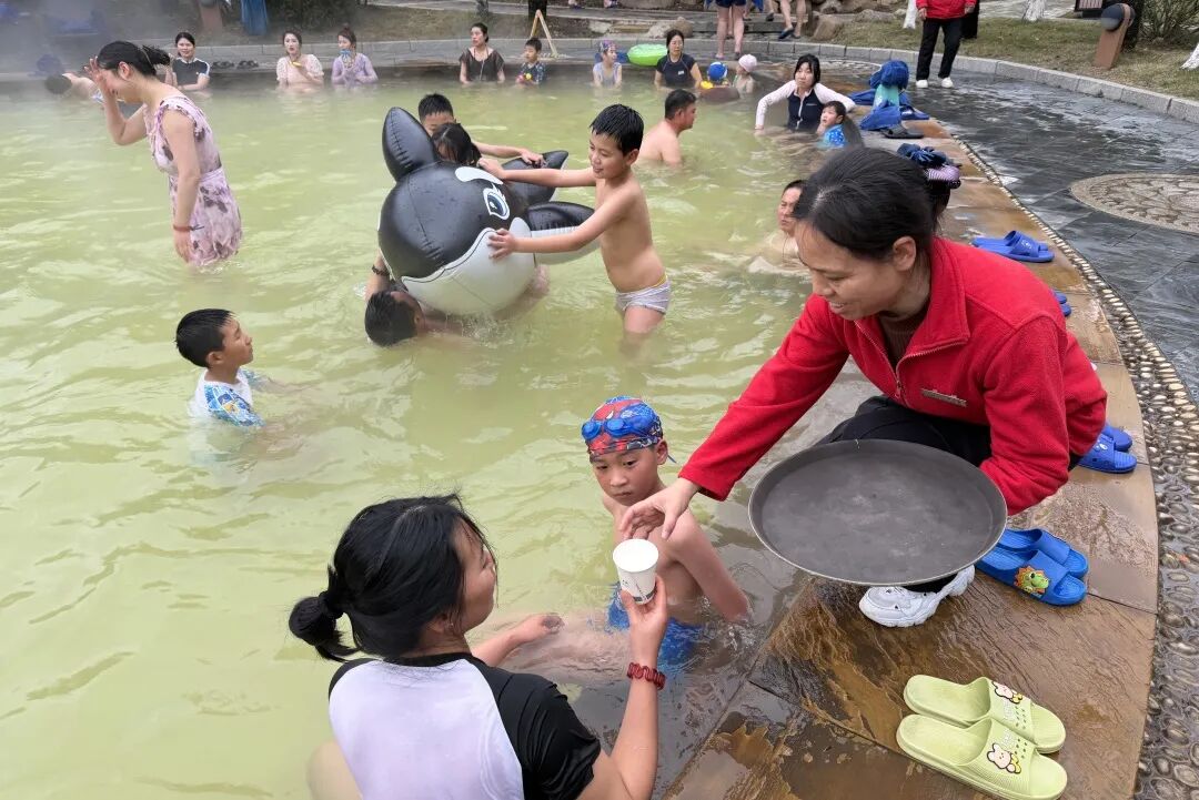 温泉区工作人员为游客递热毛巾、添暖汤,保洁人员保持公共区域整洁,安保人员巡逻保障安全;带孩子的家庭还能参与小丑互动,获得小礼物。这些细节服务让游客在满房的情况下,依然感受到了舒适与温暖。