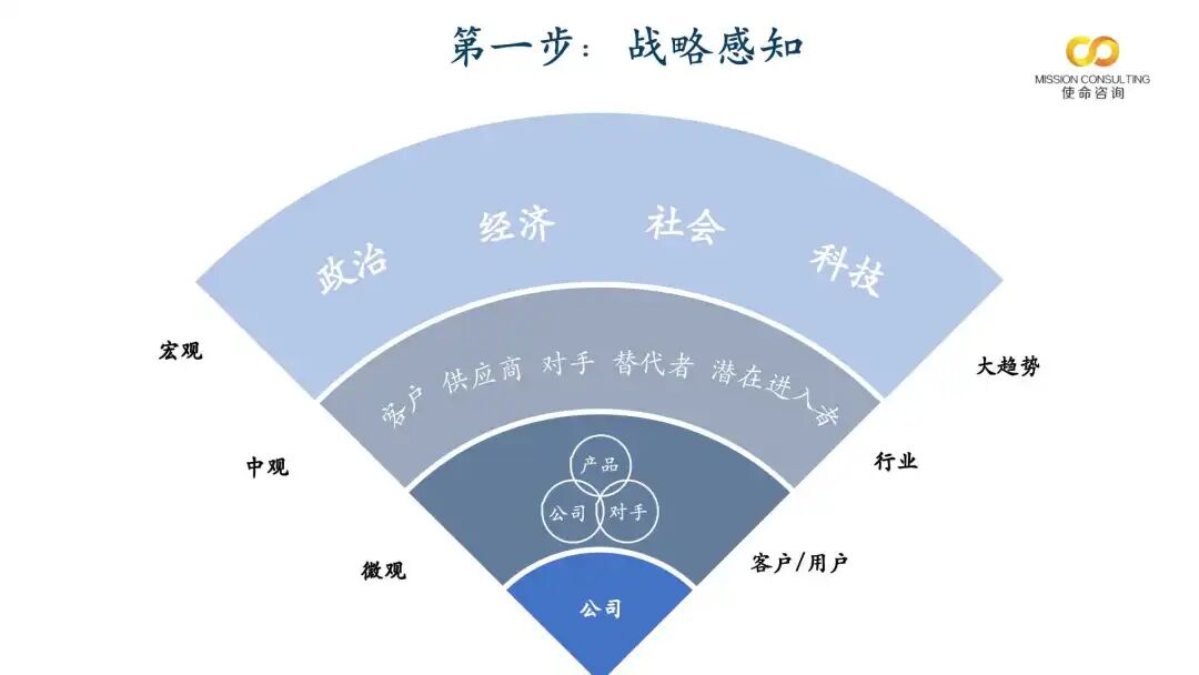 从宏观(政治、经济、社会、客户)、中观(行业利益相关方如客户、对手、供应商、替代者及潜在进入者)及微观(自身-客户-对手)三个维度调整视角,大胆提问、相互挑战、深度研讨。