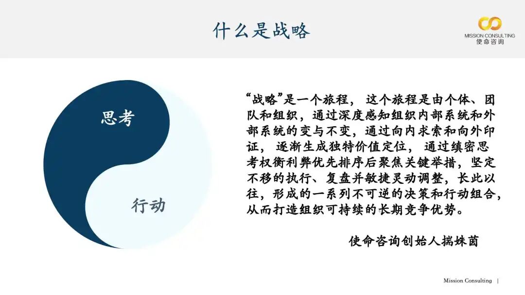 笔者认为,“战略”是一段持续探索的旅程:个体、团队与组织需深度感知内外部系统的变化与不变,通过向内求索与向外印证,逐步确立独特的价值定位;经过缜密思考、权衡利弊并优先聚焦关键举措后,坚定不移地执行、复盘并灵活调整。长此以往,形成一系列不可逆的决策与行动组合,最终打造组织可持续的长期竞争优势。