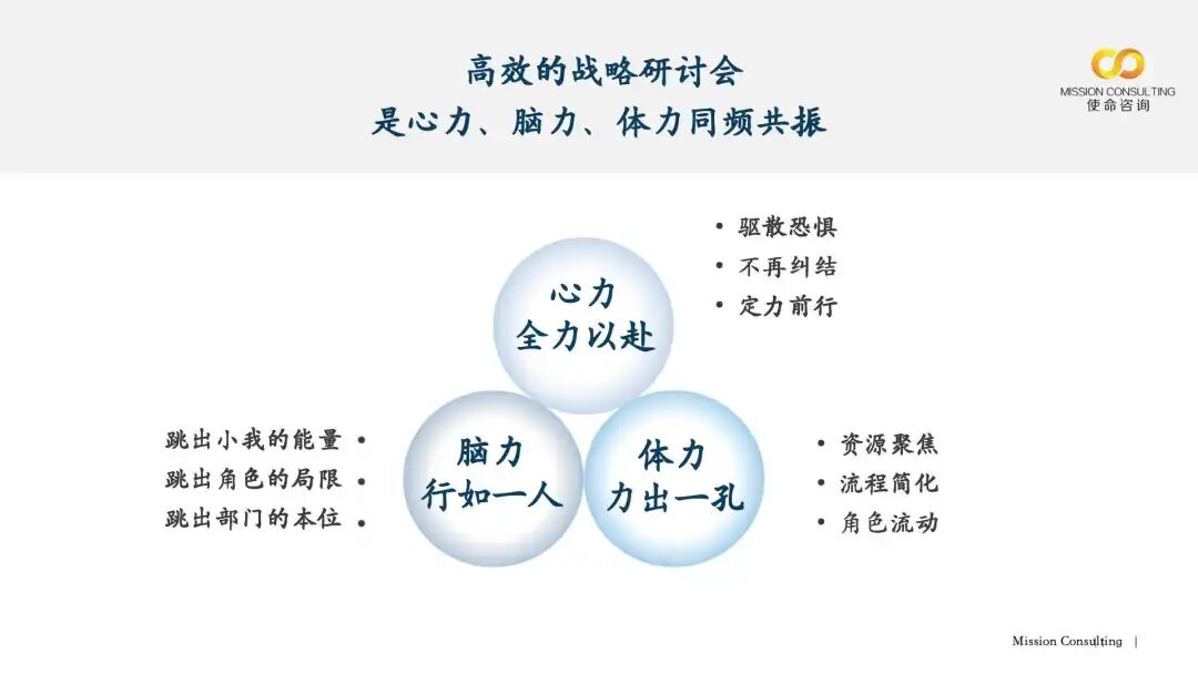 高效的战略研讨会需刚柔并济,实现心力、脑力、体力的同频共振。