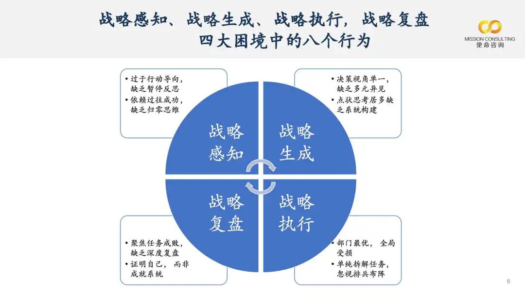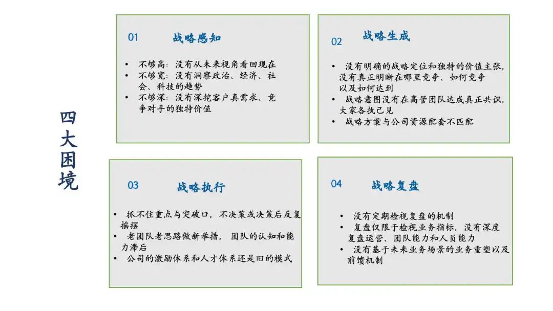 这其中包含四个核心关键词:感知、生成、执行与复盘。而在战略感知、战略生成、战略执行与战略复盘这四个场景中,企业往往会遭遇以下困境。