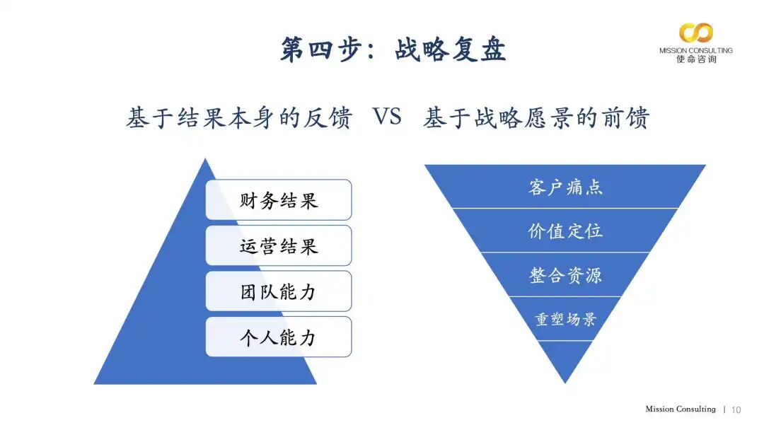 应像重视年初战略研讨会一样对待日常战略复盘会。需整合内外部数据,基于事实进行客观务实的业务结果复盘;同时,留出时间检视业务结果背后的运营、团队及人员能力(部分企业通过第三季度人才盘点会开展此工作)。建议高质量的复盘会需穿透“财务、运营、团队和人才”四个层面。基于战略愿景的前馈思考应与业务结果复盘同步进行。