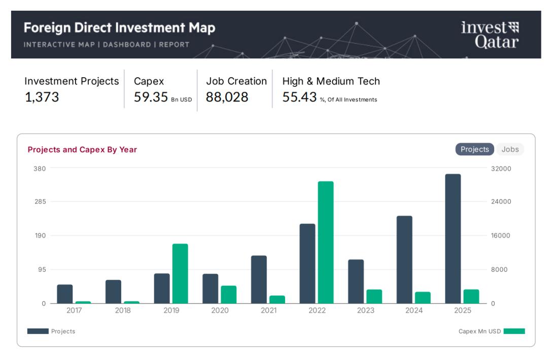 值得注意的是,国际投资者已在卡塔尔表现出极强的深耕意愿。数据显示,绿地投资项目数量已达1034个,而再投资项目在资本投入总额中占据最大比重(超过296亿美元)。