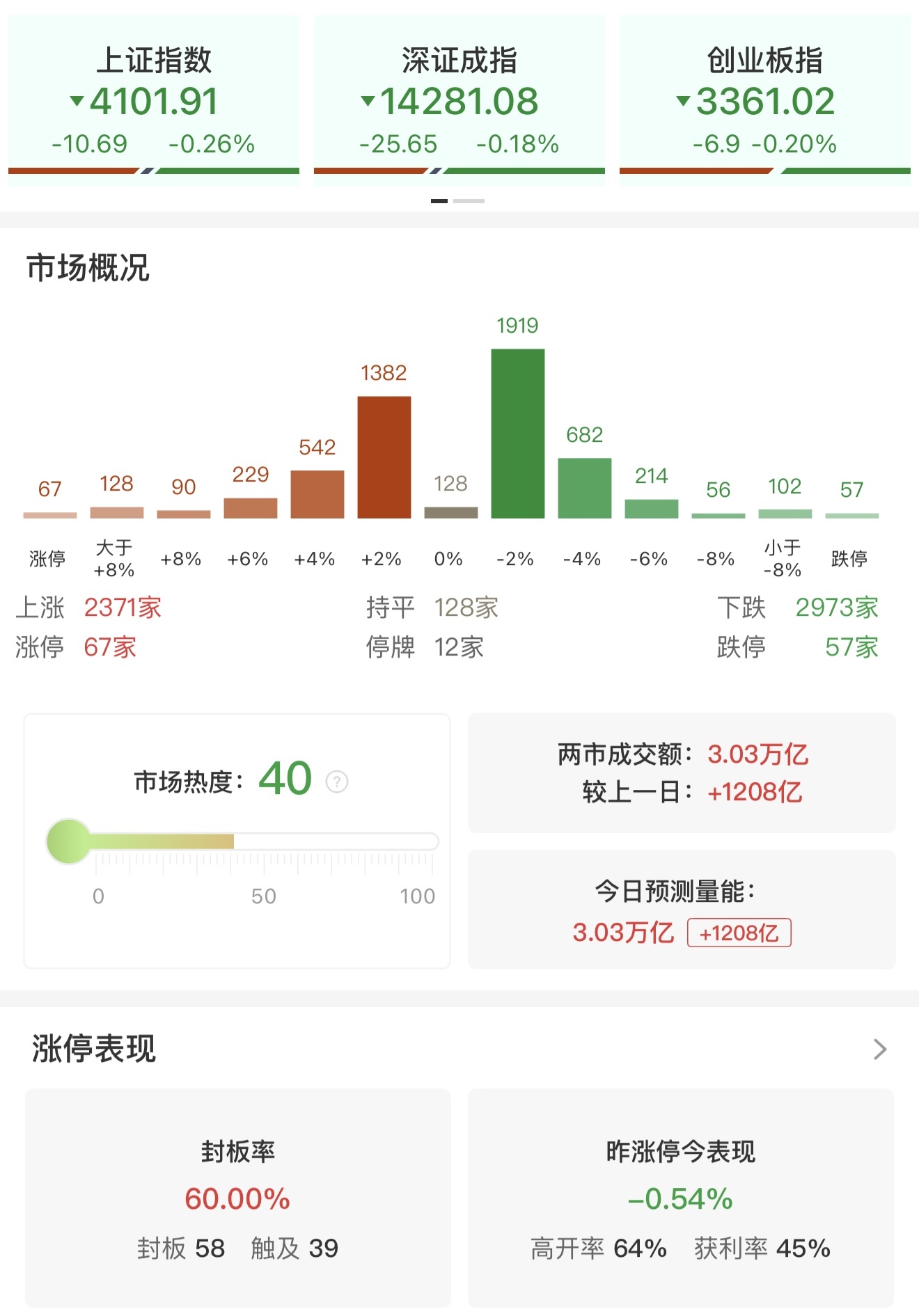 沪深两市当日成交额达3.03万亿元,较前一交易日增加1208亿元。全市场超2900只个股出现下跌。