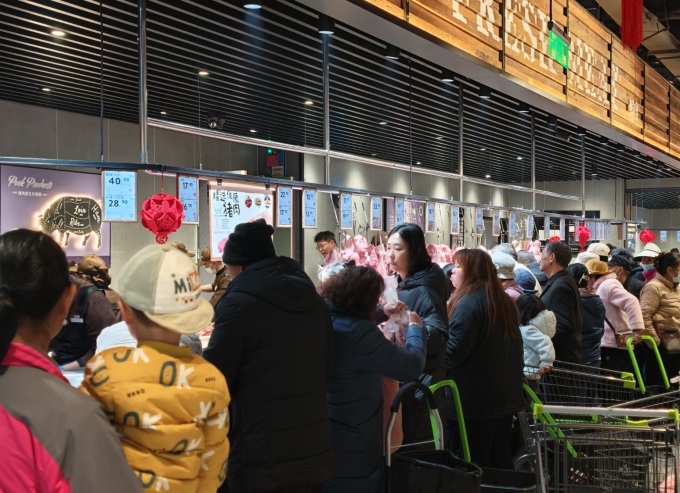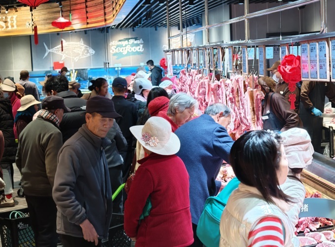 润兴万家以“舒适、通透、便捷”为核心重构卖场空间。调改后主通道由2.9米拓宽至4米,副通道由2.4米拓宽至3米,取消强制动线,采用开放式布局,提升购物自由度与便捷性。同时扩大生鲜区规模,优化牛羊肉环岛、蔬果区布局。