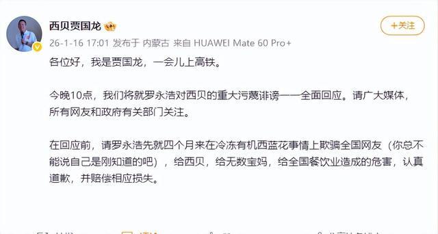 1月16日下午,西贝餐饮集团创始人贾国龙通过微博发布最新消息,表示将于当晚10点针对罗永浩此前对西贝的相关言论进行全面回应。