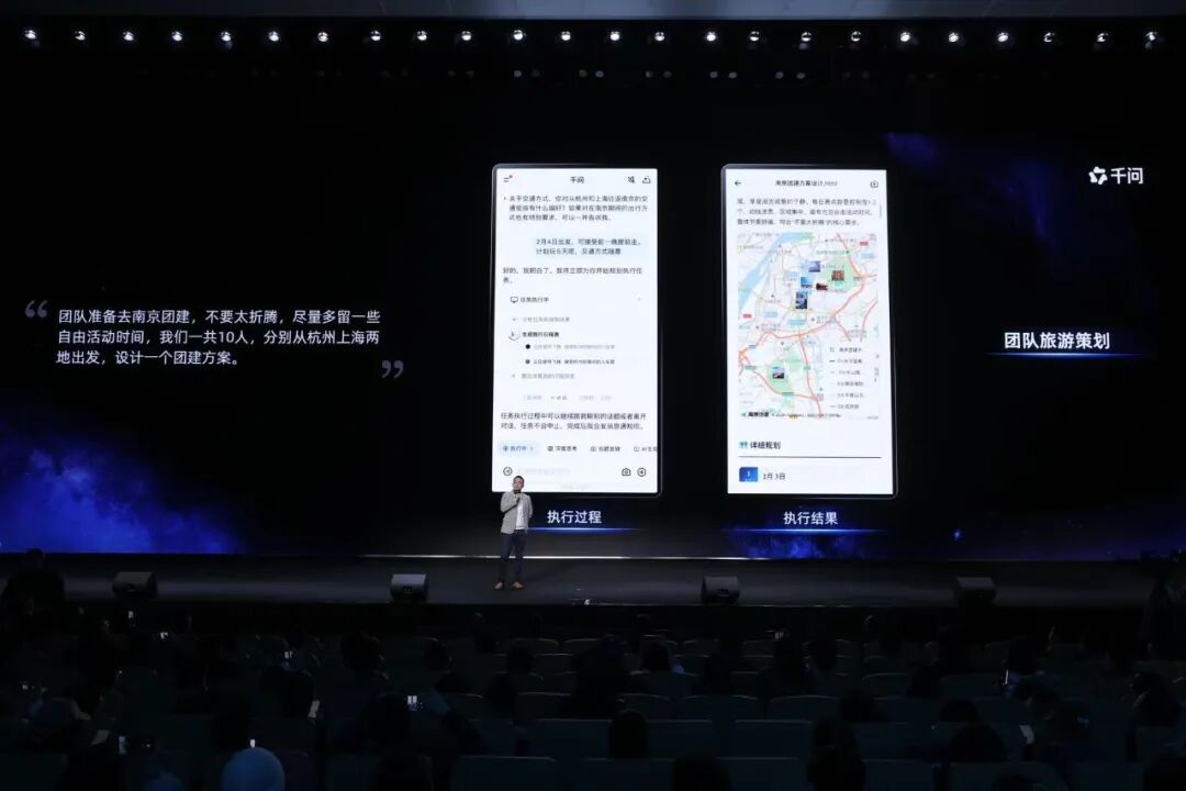 千问对生态的结合并非简单调用,而是具备复杂任务规划能力。现场演示中,千问在春节出游场景完成机票酒店预订(飞猪)、行程规划(高德)、年夜饭预订,并代用户电话沟通包厢细节(预留时间、人数、忌口、宝宝椅等),体现了AI在不确定条件下推进任务的能力。