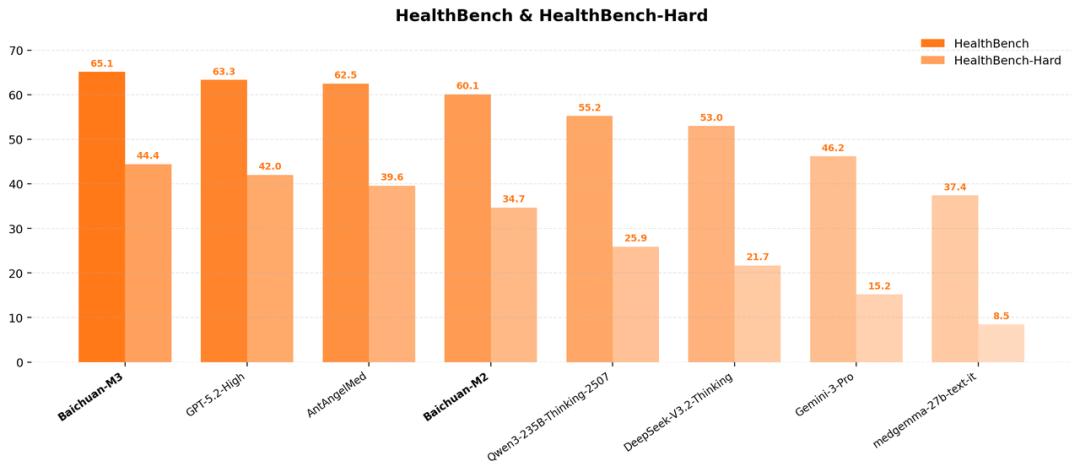 从结果来看,M3仍是一款多项第一的模型。它在HealthBench上登顶,意味着在OpenAI亲自定义的医疗能力标准体系下实现全面超越;而在更强调复杂临床决策能力的HealthBench Hard子集中,M3以44.4分夺冠,首次系统性超过GPT-5.2,这一成绩更具说服力,因为它验证的不只是回答是否专业,更是模型在高度不确定、高推理难度场景中的稳定性与可靠性。