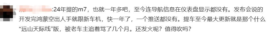 关于系统更新,一位问界M7车主称,提车刚过一年多,仪表盘始终无法显示导航信息,这段时间里从未收到过任何系统更新推送。