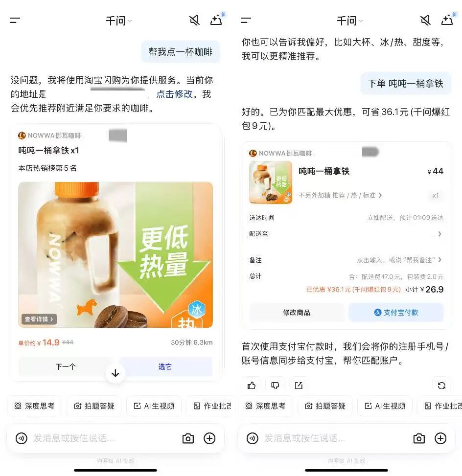 消费者打开千问App,下达“帮我点一杯咖啡”指令,授权后千问会根据地址推荐附近咖啡店,显示预计送达时间,自动计算红包满减并进入支付页面。