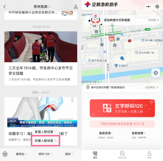 苏州市急救中心推出“听障人士呼救功能”,通过“企鹅急救助手”小程序和“苏州急救”服务号,实现文字呼叫、语音文字互转、位置自动上报等服务,为听障群体打通生命救援通道。(详情)