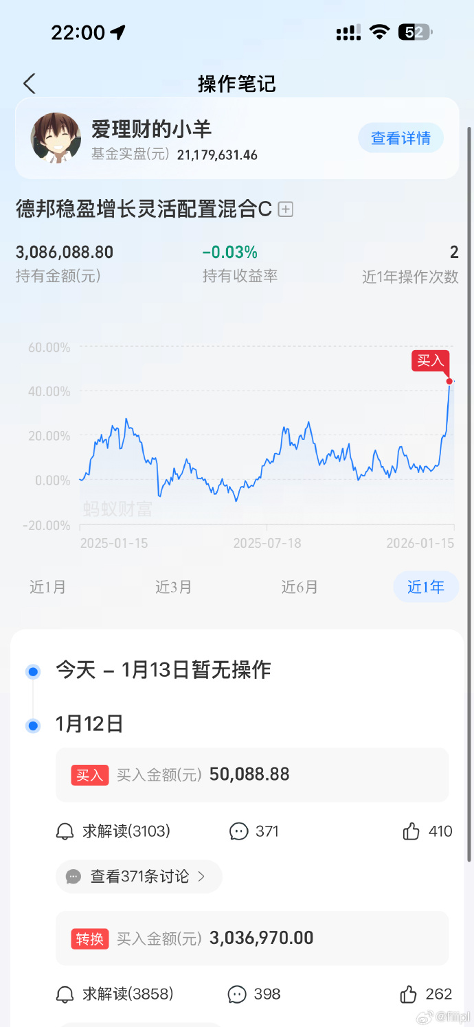 拥有422.4万抖音粉丝的大V“爱理财的小羊”在1月12日进行了投资切换,将308万实盘资金从CPO板块转向软件板块,其中买入德邦稳盈增长基金5万,并转换303万,合计投入308万。