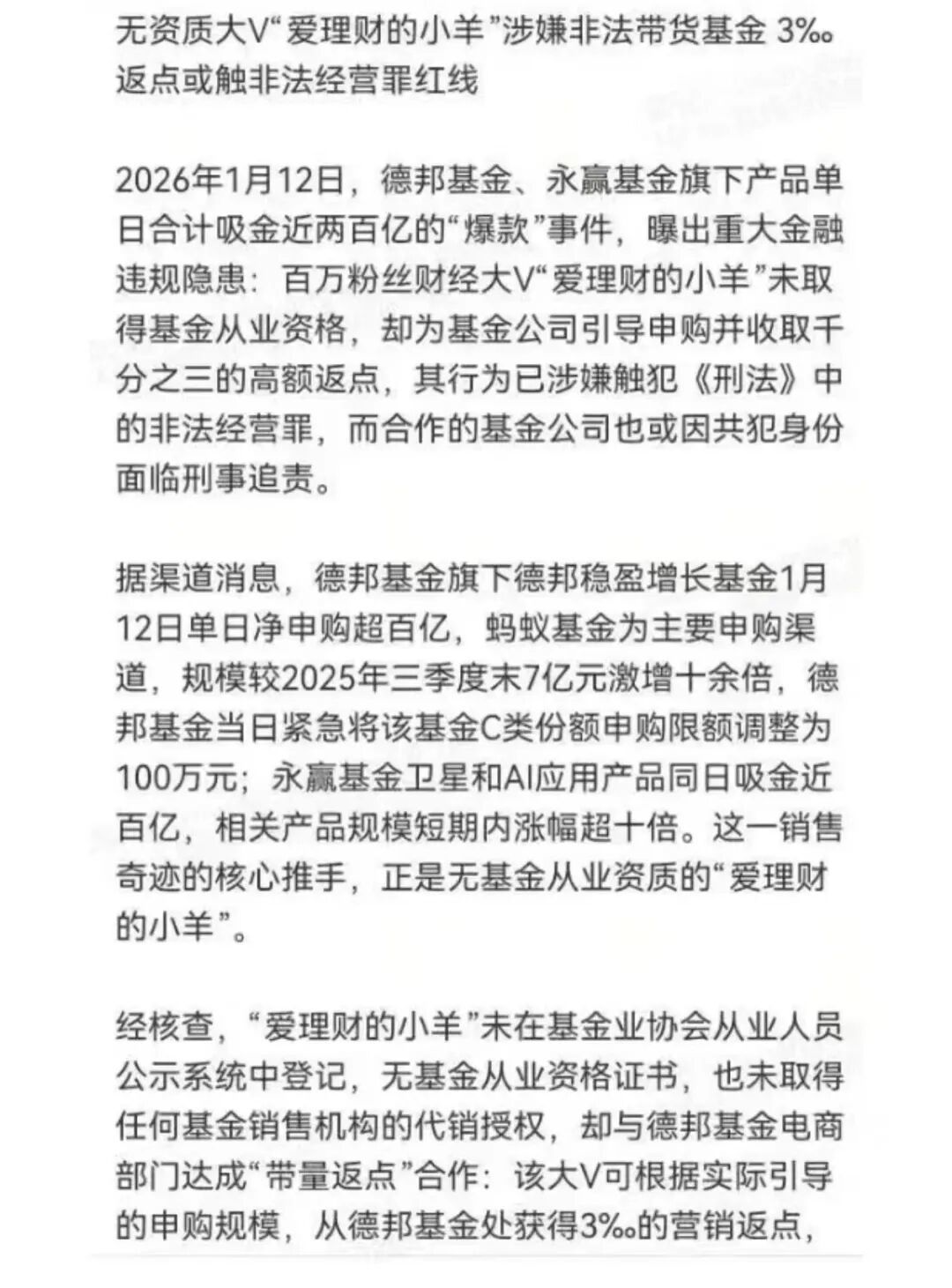 更有消息称,“爱理财的小羊”未取得基金从业资格却引导粉丝申购基金,并收取千分之三的返点,涉嫌违反《刑法》中的非法经营罪,合作的基金公司也可能面临责任追究。若按100亿规模计算,返点金额可达3000万。