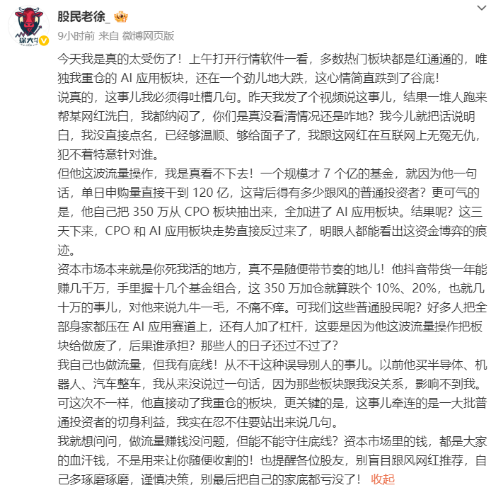 该大V的操作引发粉丝跟风,不少人买入德邦稳盈基金,部分粉丝随后表示投资出现亏损。另一位拥有227万粉丝的大V“股民老徐”则不点名批评了某网红,称其流量操作导致小规模基金单日申购量暴增,背后有大量普通投资者跟风,且其自身的板块切换行为存在资金博弈痕迹。