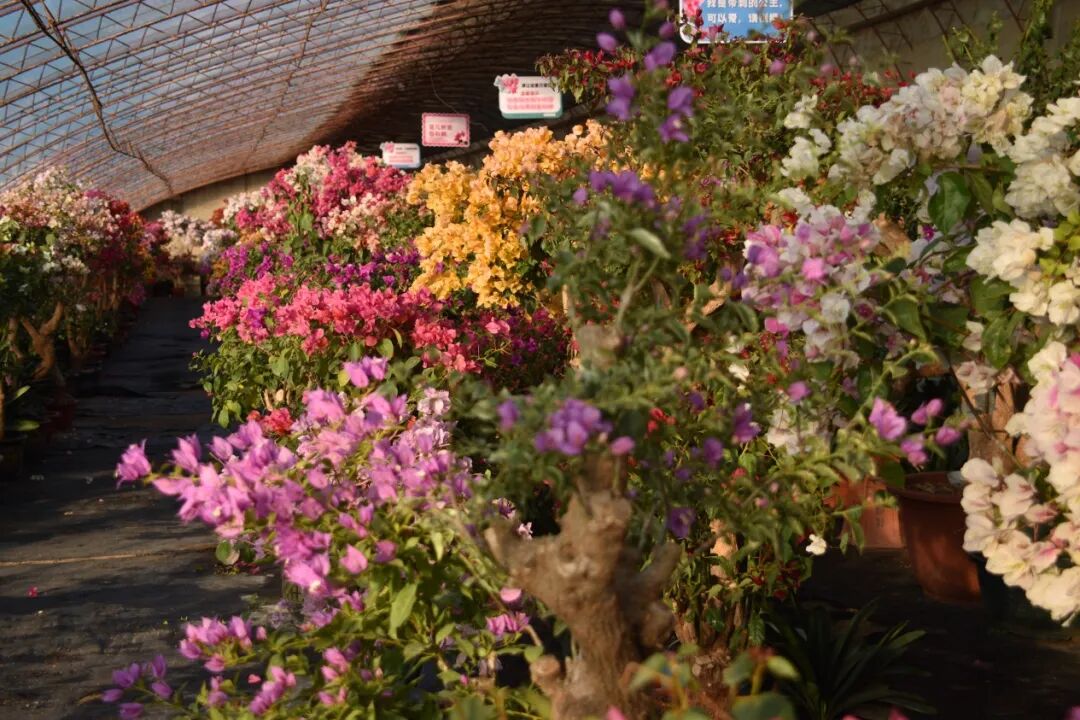 近万盆三角梅开得热烈奔放,玫红似火、亮橙耀眼、淡绿清新,80多个品种的花朵簇拥枝头,织成一片斑斓锦缎,让人仿佛误入南国春日。