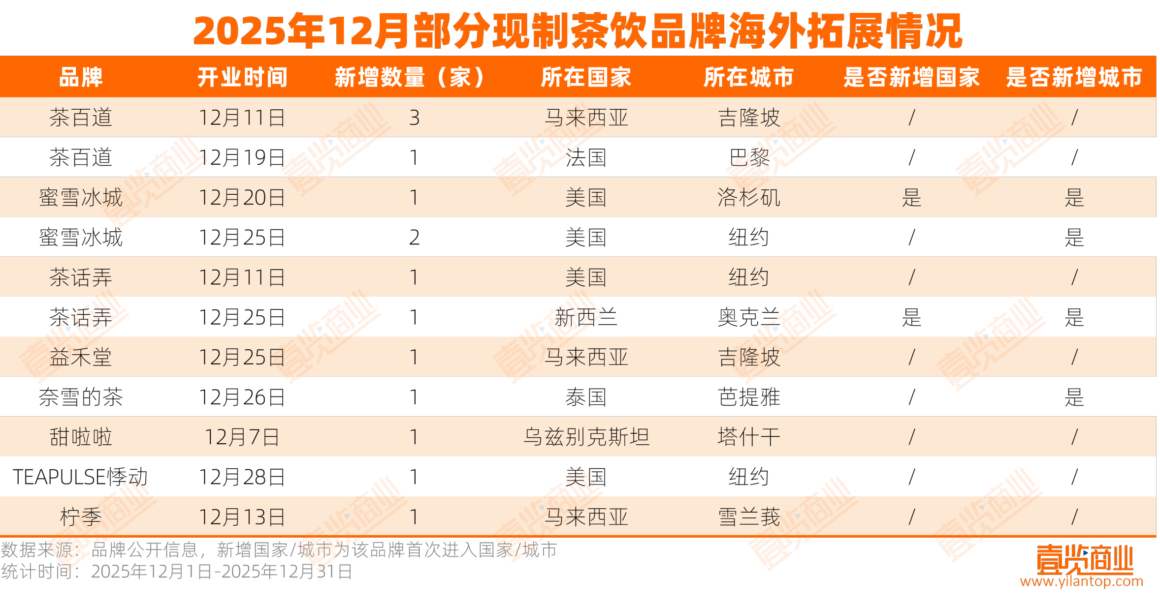 8个茶饮品牌2025年12月海外拓店14家 东南亚与美国成热门区域