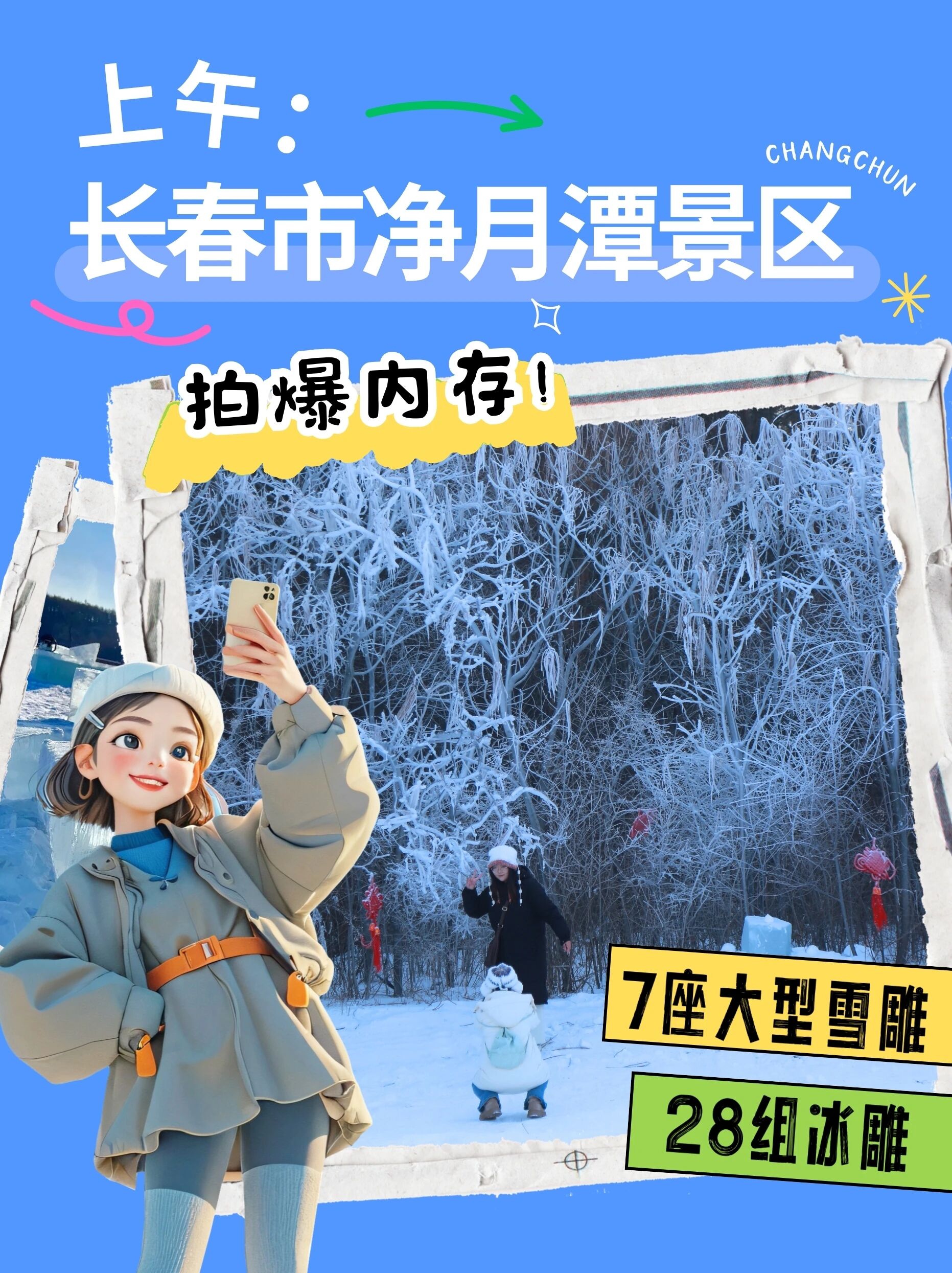 第一站:长春市净月潭景区。和闺蜜在雪雕与冰雕的世界里疯狂拍照!蓝冰钻石海、“蓝冰钻石爱情海”“一路生花”冰花墙……出片率直接拉满200%!还体验了森林穿越雪飘流、雪地摩托,在森林雪道里尖叫的感觉太快乐啦!