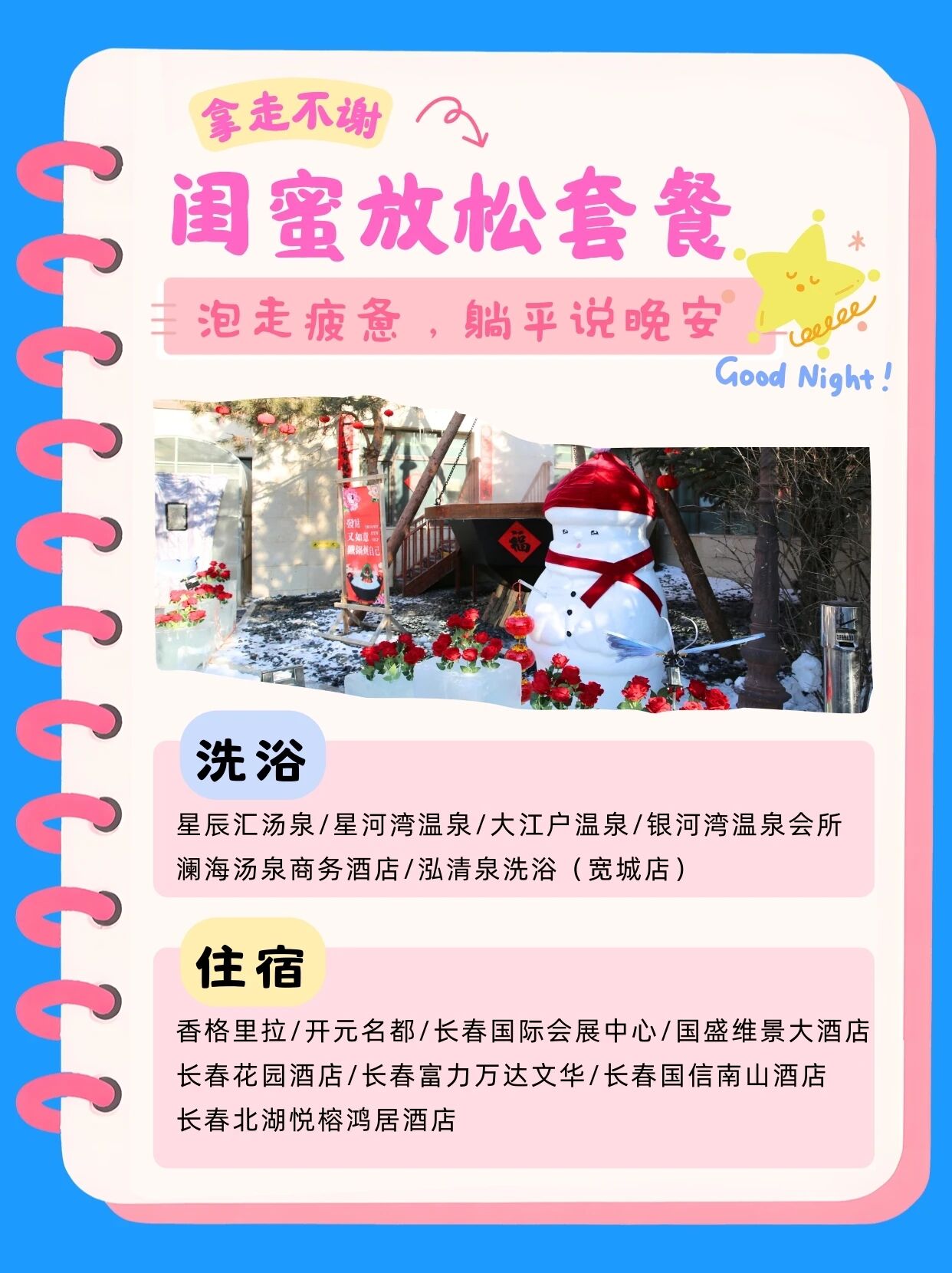 放松时刻:玩累了,温泉必须安排上!泡完温泉瞬间“回血”!再选个舒服的酒店休息,快乐一整天完美收官~长春真的超适合闺蜜旅行!快@你的姐妹,这个冬天一起冲!