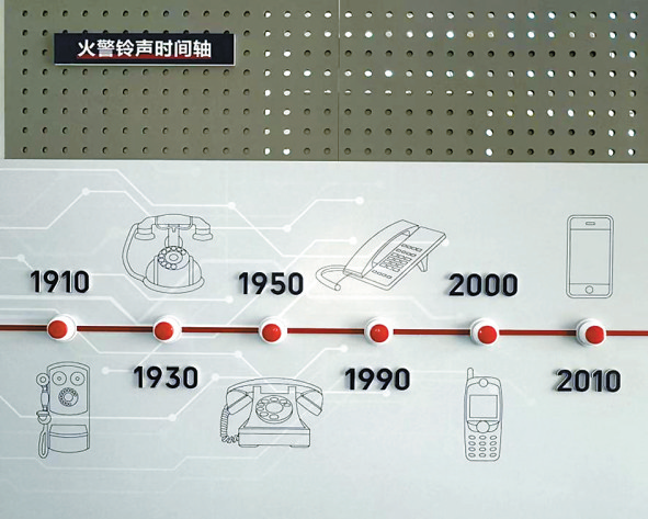 展厅中的互动装置“火警铃声时间轴”串联1910-2010年通信工具,按下年份按钮可听到不同时代的铃声,展现报警载体的百年变迁。