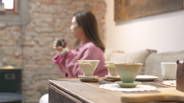 河对岸的MM咖啡,是一场流动的陶艺展,也是一杯有温度的咖啡。店里的咖啡器具全是来自驻村艺术家工作室的作品,器型、釉色与手感都诉说着不同的故事。咖啡的香气仿佛也透过这独特的呼吸感,变得更加立体。更妙的是,整个空间就是一个常设的微型美术馆,不定期轮换驻村艺术家的手作器物展,让你边喝咖啡边逛展。
