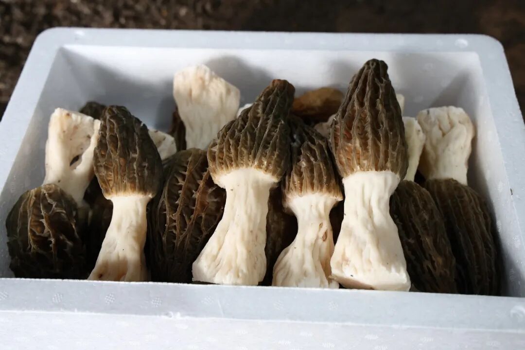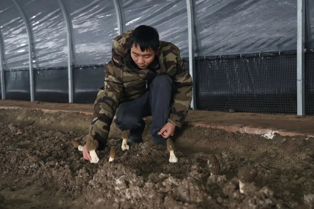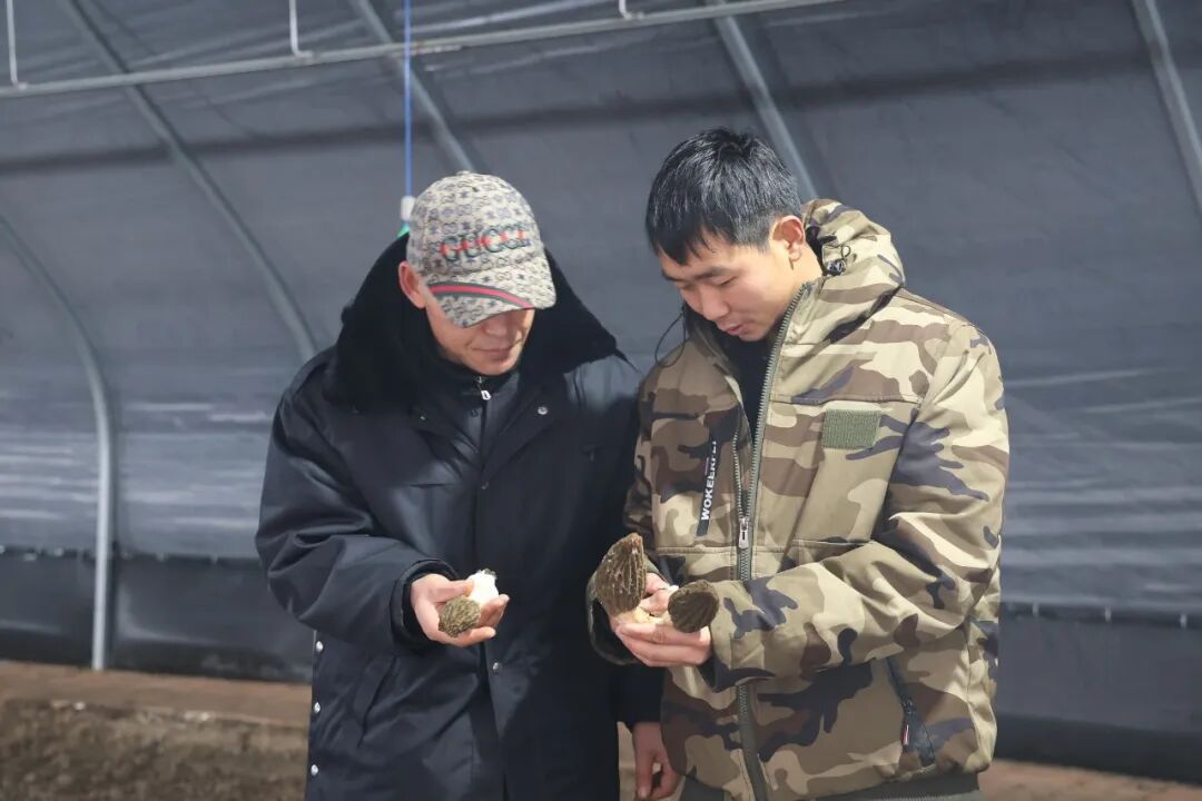 在突泉县曙光食用菌产业园内,一排排羊肚菌种植大棚整齐排列。棚内,一朵朵羊肚菌如同小伞般从地面冒出,错落有致地生长在菌垄上,技术员们正忙着采收。