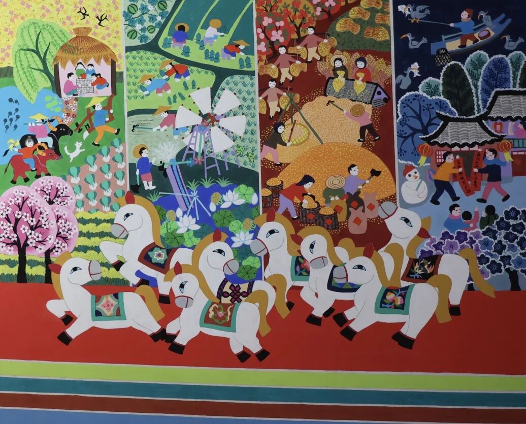同样以马为主题,陈惠方的《八骏循时图》则藏着巧思,他以“四季入画、八骏牵年”的构思,把马年的意趣和江南农耕的烟火气完美融合。