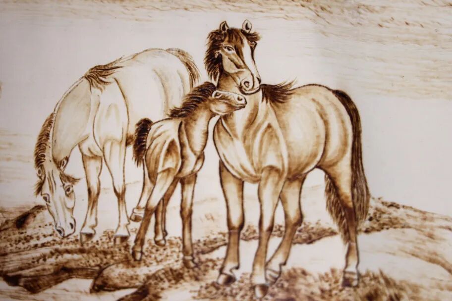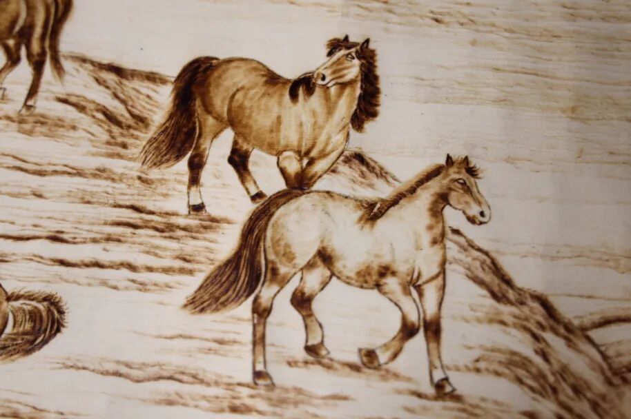 随着电烙铁温度的细微变化,宣纸表面慢慢烫印出深浅不一的褐色纹路,骏马的轮廓与细节逐渐清晰。