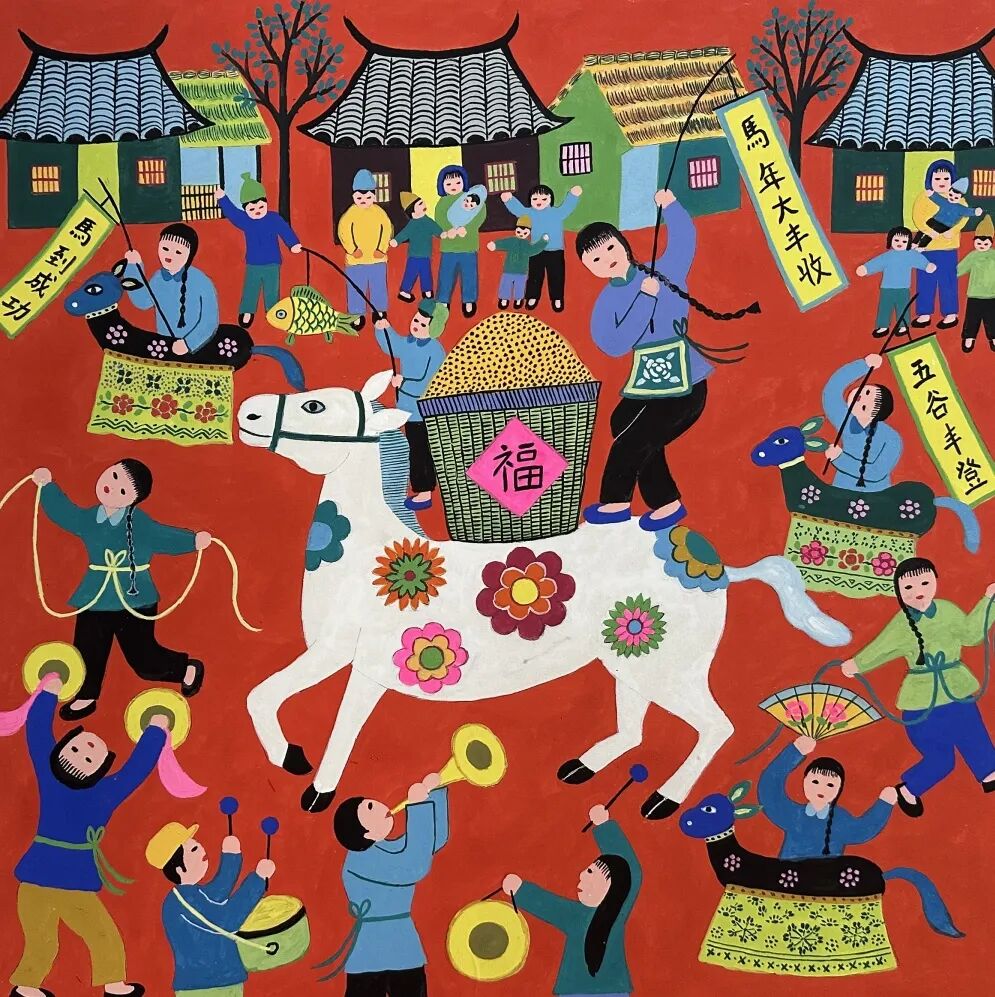 陈卫雄的作品《马年兴旺》,以浓烈的乡土色彩和鲜活的民俗场景,提前营造出新春的喜庆氛围。红色的底色上,一匹装饰着繁花的白马驮着写有“福”字的谷仓,饱满的金黄稻粒象征着丰收的喜悦;画中还有十多位村民,有的敲锣打鼓,有的举着“马年大丰收”“五谷丰登”的旗帜,热闹的串马灯民俗活动穿插其中,一派欢腾祥和的景象。