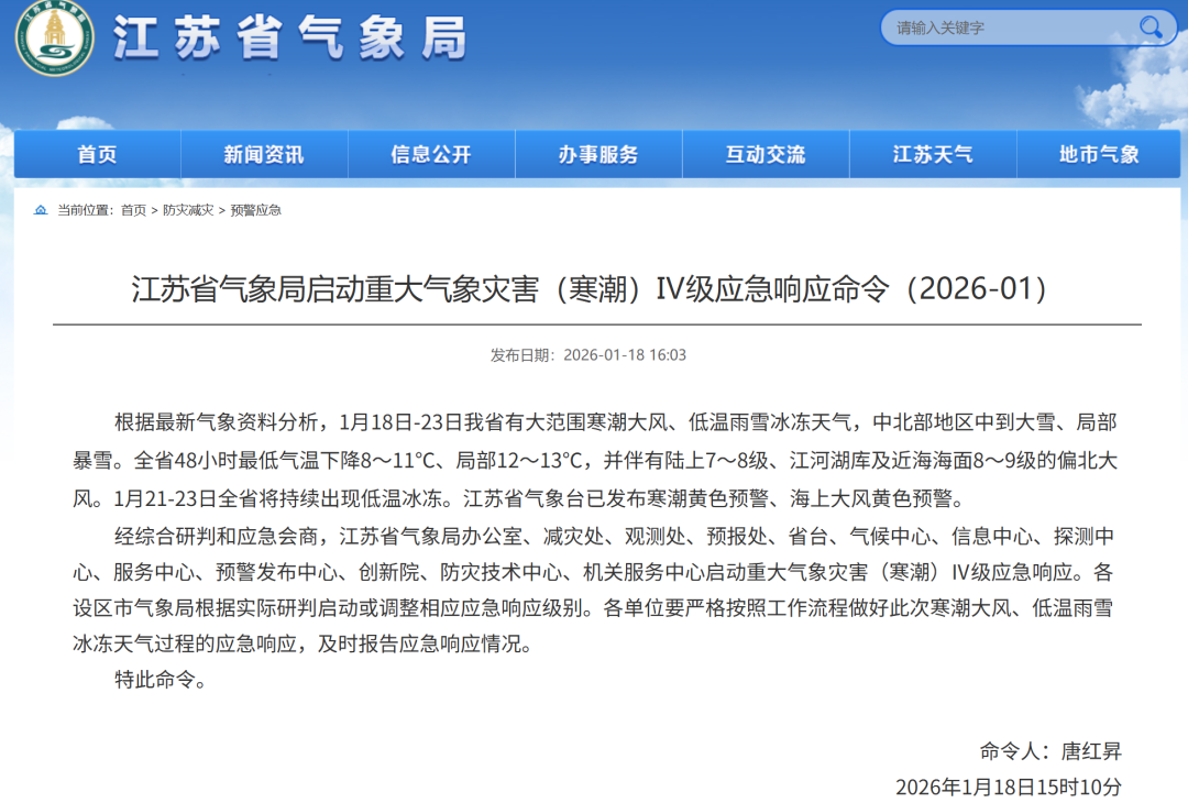 经综合研判和应急会商,江苏省气象局多个部门启动重大气象灾害(寒潮)Ⅳ级应急响应,各设区市气象局也将根据实际情况调整应急响应级别,各单位需严格做好应急响应工作。