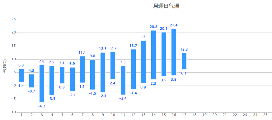 无锡未来天气情况:19-20日北方强冷空气南下,风力增大,有雨雪天气,气温大幅下降;21日起天气转好,但早晨气温较低,21-24日最低气温都在-3℃以下,会出现连续冰冻。
