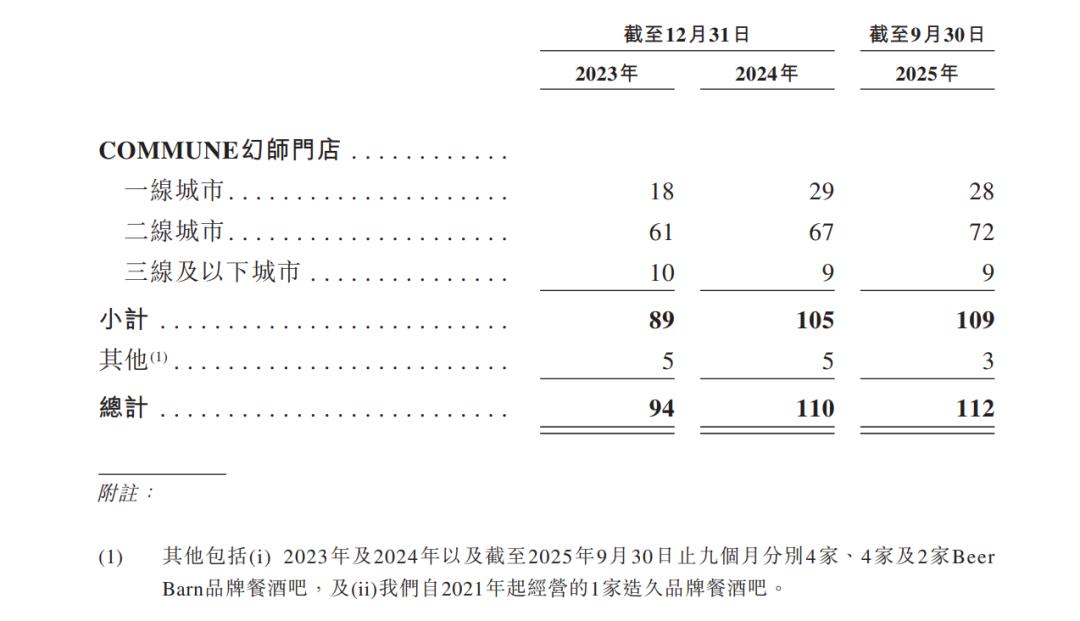高占比酒水饮料收入是幻师高毛利的核心来源。2025年前三季度,酒水和饮料贡献约45%的营收,其中85%为酒精饮品,其毛利率显著高于餐食。更值得关注的是,自有品牌酒水布局进一步增厚利润空间。截至2025年9月30日,幻师已推出14个自有品牌包装酒饮SKU,自有品牌占酒精饮料总销售额比例超20%。据报道,店内售价20元/瓶的幻师啤酒,外部采购成本极低,淘宝渠道单瓶约2.5元,该单品毛利率可达87.5%。截至2025年9月30日,幻师已在全国40个城市运营112家直营门店,其中109家以“COMMUNE幻师”品牌经营,涵盖适配二、三线城市的标准店与布局一线城市核心地段的臻选店,形成分层覆盖的全国性网络。