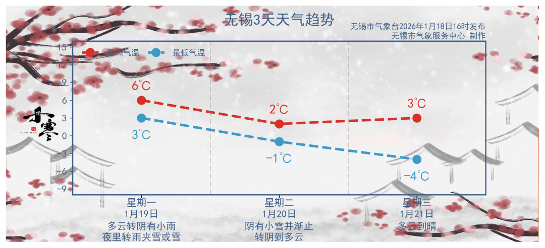 无锡逐日天气情况为:19日多云转阴天,傍晚有小雨,夜间转雨夹雪或雪,雨雪量中等局部偏大,东北风5至6级,气温6℃到11℃;20日阴有小雨夹雪或小雪,偏北风5至6级,气温0℃到2℃;21日阴转多云,偏北风4级左右,气温-3℃到2℃;22日多云转晴,偏北风3至4级,气温-5℃到3℃;23日至24日晴到多云,偏北风3至4级,气温-4℃到7℃。