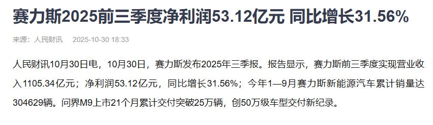 赛力斯的收益远不止品牌升级。尽管采购成本高昂,但其利润表现同样亮眼:2024年净利润达59.46亿,2025年前三季度净利润突破53亿,全年预计盈利83至100亿。